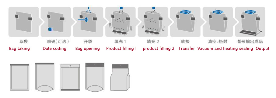 രണ്ട് വ്യത്യസ്ത ഉൽപ്പന്നങ്ങൾ തൂക്കുന്നതിനുള്ള ഒരു സെറ്റ് ZL20-1.6L മൾട്ടി ഹെഡ്സ് വെയ്റ്റിംഗ് മെഷീൻ, ഒരു സെറ്റ് ZL8-230 റോട്ടറി ബാഗ് ടേക്കിംഗ് ഓപ്പണിംഗ് ഫില്ലിംഗ് സീലിംഗ് മെഷീൻ, ഒരു സെറ്റ് DT5 ബക്കറ്റ് എലിവേറ്റർ, ഒരു സെറ്റ് സേഫ്റ്റി പ്ലാറ്റ്ഫോം, ലാഡർ എന്നിവ ഉൾപ്പെടുന്ന ഈ യൂണിറ്റ് മെഷീനാണിത്. പ്രധാന മെഷീൻ സീമെൻസ് പിഎൽസിയുടെ നിയന്ത്രണവും ടച്ച് സ്ക്രീൻ ഉപയോഗിച്ചാണ് പ്രവർത്തിക്കുന്നത്. പ്രശസ്തമായ ഇലക്ട്രിക്കൽ ആക്സസറികൾ സ്വീകരിക്കുക. ഉയർന്ന ഓട്ടോമേഷനും പ്രവർത്തിക്കാൻ എളുപ്പവുമാണ്. ദിവസേനയുള്ള കെമിക്കൽ, ഭക്ഷണം, കെമിക്കൽ തുടങ്ങിയ വ്യത്യസ്ത വ്യവസായങ്ങൾ വ്യാപകമായി ഉപയോഗിക്കുന്നു.