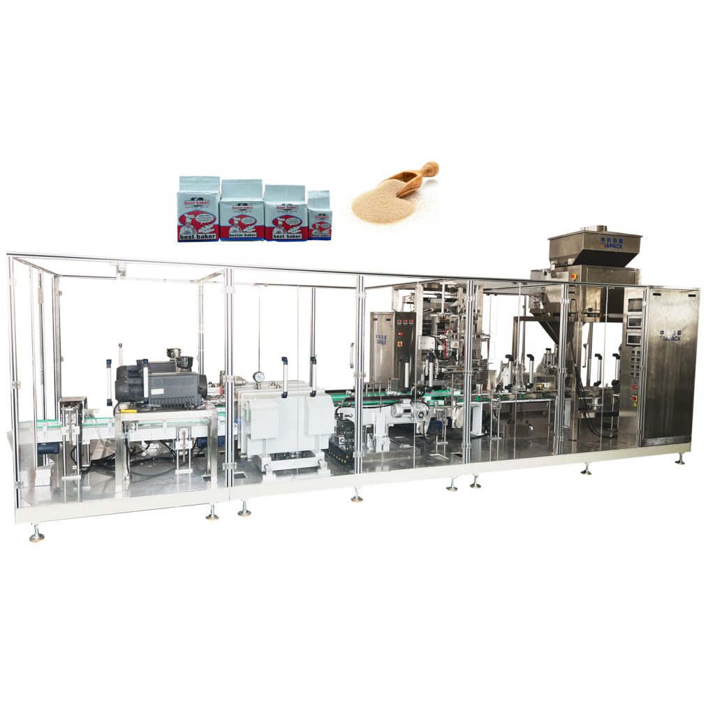 ഉണങ്ങിയ യീസ്റ്റ് നൽകുന്നതിനുള്ള ഒരു സെറ്റ് ZK3 വാക്വം എലിവേറ്റർ, ഒരു സെറ്റ് ZL520 വെർട്ടിക്കൽ ബാഗ് നിർമ്മാണം, സീലിംഗ് മെഷീൻ എന്നിവ ഉൾപ്പെടുന്നു. ഒരു സെറ്റ് ZLC4-2000 നാല് ബക്കറ്റ് വെയ്യിംഗ് മെഷീൻ, ഒരു സെറ്റ് ZL-100V2 ഡബിൾ വാക്വം ചേമ്പർ പാക്കിംഗ് മെഷീൻ. ഫുഡ് ഫാർമസി കെമിക്കലും മറ്റ് ഉൽപ്പന്നങ്ങളും പൊടിയിലോ ചെറിയ ഗ്രാന്യൂളിലോ പായ്ക്ക് ചെയ്യുന്നതിന് ഈ യന്ത്രം വ്യാപകമായി ഉപയോഗിക്കുന്നു. കാപ്പിപ്പൊടി, യീസ്റ്റ് പൗഡർ ഗോതമ്പ് മാവ് തുടങ്ങിയവ പോലെ. മുഴുവൻ മെഷീനും വാക്വം ഉൽപ്പന്നത്തിലേക്ക് പമ്പിംഗ് നടത്തുന്നു. വാക്വം ഡിഗ്രി വളരെ ഉയർന്നതാണ് കൂടാതെ പാക്കിംഗ് വേഗത വളരെ ഉയർന്നതാണ് 30 ബാഗ്/മിനിറ്റിൽ എത്താം .പൂർത്തിയായ ഉൽപ്പന്നത്തിന് ദൈർഘ്യമേറിയ ഷെൽഫ് ലൈഫും ഭംഗിയുള്ള രൂപവുമുണ്ട്.